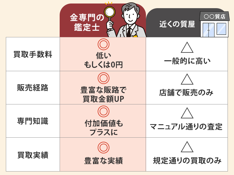 質屋と金専門の鑑定士の違い4つ(素材の判定、重さ判定、デザイン価値、実績)